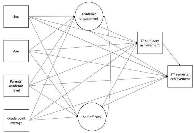With this study, we aimed to analyse some predictors of academic achievement in first-year students. In order to explain academic achievement at the end of the 1st and 2nd semesters, we included variables such as sex, age, parental educational level, and grade point average to enter HE in the prediction model. In addition, we included students’ academic engagement and self-efficacy in the model, measured after some weeks at university, and academic achievement in the 1st semester as a predictor of academic achievement in the 2nd semester.