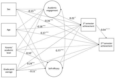 The results show that personal variables such as age and sex had a statistically significant path to 1st semester academic achievement, and showed that younger students and female students demonstrated better academic performance. These results are in line with the literature, where female students are often described as having better levels of engagement in academic activities, better attendance, higher levels of participation in class, and better study methods or deeper approaches to learning (Diniz et al., 2018; Dwyer et al., 2013). Older students tend to have lower academic performance in their 1st year in HE and are more likely to dropout (Figuera et al., 2015; Lassibille & Gómez, 2009; Tinto, 2010). Older students often have some years without studying, and could have an academic background marked by failure or even dropout. They have been found to present lower levels of academic self-regulation skills, difficulties in creating study routines, and even learning difficulties and lower performance levels (Fanelli & Deane, 2015).