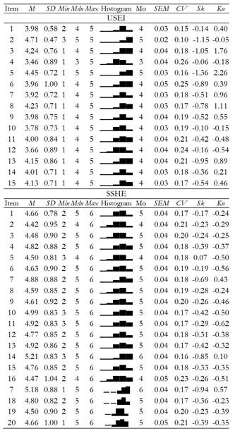 The descriptive statistics of the items are presented in Table 1. The USEI items demonstrated acceptable evidence in terms of psychometric sensitivity, without severe univariate normality violations (Finney & DiStefano, 2013; Marôco, 2021). However, two items (item 1 and item 2) did not have the full range of possible answers (i.e., 1 to 5).
