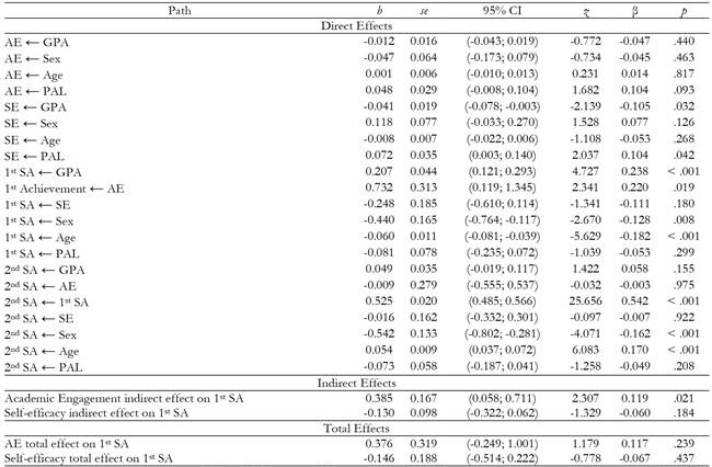 The structural model (Table 2) presented an acceptable fit to the data (χ2(751) = 1,648.393, p < .001, χ2/df = 2.195, n = 447, IFI = .987, CFI = .987, TLI = .988, SRMR = .060, RMSEA = .052, P(RMSEA ≤ .05) = .193, 90% CI (.048; .055)). The regression path of the GPA to 1st semester achievement was statistically significant (β1SA<-GPA = 0.238; p < .001). Parents’ academic level had a statistically significant path to the perception of self-efficacy (βSE<-PAL = 0.104; p = .042). Sex and age had a statistically significant path to both 1st semester achievement (β1st SA ← sex = -0.128; p = .008; β1st SA ← age = -0.182; p < .001) and 2nd semester achievement (β2nd SA ← sex = -0.162; p < .001; β2st SA ← age = 0.170; p < .001). Students’ academic engagement had a statistically significant path to 1st semester achievement (β1st SA ← AE = 0.220; p = .019), while 1st semester achievement had a significant path to 2nd semester achievement (β2nd SA ← 1st SA = 0.542; p < .001) and was the strongest of all the paths. The indirect effect of student academic engagement on 2nd semester achievement was statistically significant (β1st SA ← AE × 2nd SA ← 1st SA = 0.119; p = .021), while the total effect was not statistically significant (β2nd SA ← AE + (1st SA ← AE × 2nd SA ← 1st SA) = 0.117 p = .239). The indirect effect of perceived self-efficacy on 2nd semester achievement was not statistically significant (β1st SA ← SE × 2nd SA ← 1st SA = -0.060; p = .184), nor was the total effect statistically significant (β2nd SA ← SE + (1st SA ← SE × 2nd SA ← 1st SA) = -0.067 p = .437). Finally, the correlation between the second-order latent variables academic engagement and self-efficacy was positive, strong, and statistically significant (r AE, SE = .780; p < .001). The model explained 35.2% of the the 2nd semester achievement variance (r22nd SA = .352) and 15.0% of the first semester achievement variance (r21st SA = .150). Table 2 shows the standardized regression coefficients (β) and their 95% confidence intervals.