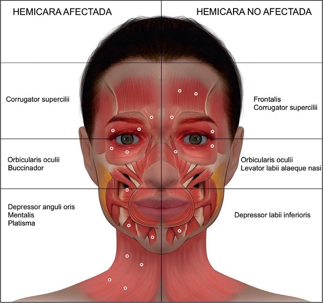 Figura 1. Zonas de aplicación y músculos objetivo de la toxina botulínica en pacientes con sincinesias e hipercinesias postparálisis facial en las hemicaras afectada y no afectada.