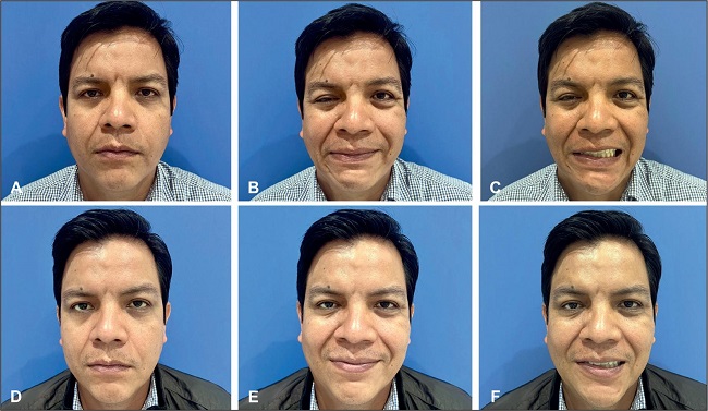 Figura 2. Resultados en reposo (A y D), de "sonrisa social" (B y E), y de sonrisa con exposición dental (C y F), pre y 3 meses después de tratamiento de parálisis rígida y sincinesias con toxina botulínica y reentrenamiento neuromuscular. Se administró TB en músculos orbicularis oculi, depressor anguli oris, mentalis y platisma de la hemicara afectada y en el músculo frontalis de la hemicara no afectada.
