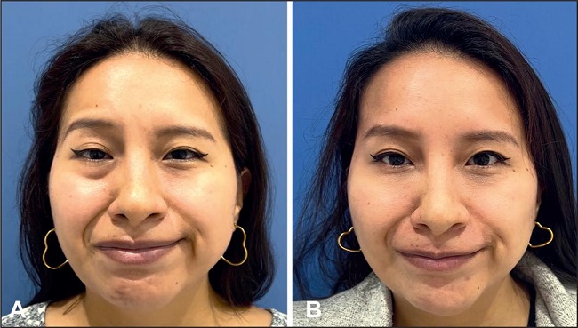 Figura 3. Imágenes pre (A) y 2 meses post (B) tratamiento de restauración de la "sonrisa social" o "sonrisa de Mona Lisa" (sonrisa con desplazamiento lateral y superior de la comisura labial) en una paciente con parálisis rígida secundaria a parálisis de Bell, mediante la aplicación de toxina botulínica en los músculos depressor anguli oris, mentalis y platisma. Además, se administró toxina botulínica en el orbicularis oculi para tratar la sincinesia oro-ocular, así como en el corrugator supercilii y el frontalis de la hemicara no afectada. Finalmente, se aplicó ácido hialurónico en los surcos nasogenianos.
