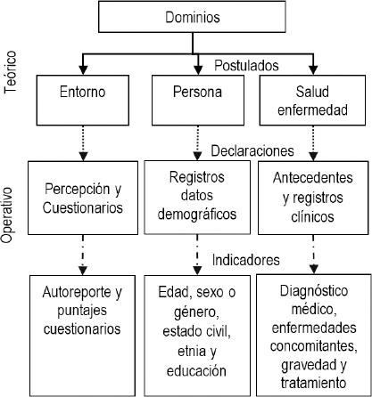 Operacionalización de conceptos con indicadores empíricos: El concepto de persona se operacionalizó a través de registros de datos demográficos y antecedentes médicos,6,15,21-28 mientras que el concepto de medio ambiente se evaluó mediante la percepción de los profesionales respecto a la presencia de redes de apoyo15,22,23 y mediciones estandarizadas respecto a percepciones del personal sanitario sobre la experiencia de sus pacientes.25