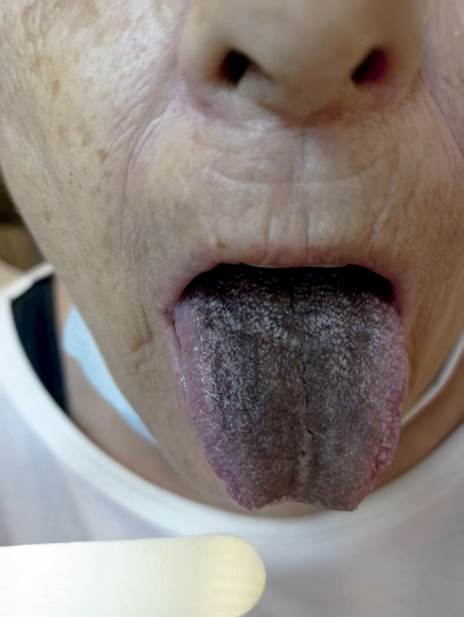 Figura 1. Lengua de coloración oscura en la superficie dorsal asociada a hipertrofia de papilas filiformes.