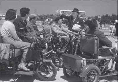 En todo caso, el retrato de Don Vicente se diferencia sustancialmente del que se ofrece del resto de personajes con discapacidad, estos de tipo físico, lo que seguramente es una clave importante. El grupo de amigos motorizados, se describen con una humanidad y dignidad prácticamente desconocida en el cine de la época. En realidad, esta dignidad parece estar estrechamente ligada a la independencia que les da el vehículo motorizado. En ese sentido, cabe llamar la atención sobre una corta escena en la que un joven, sin manos ni antebrazos, arranca y conduce con agilidad una moto, frente a la cara de asombro, y envidia, de Don Anselmo. Ciertamente, el vehículo adaptado, “la silla de cojos” que le dicen unos niños, también tiene sus limitaciones, y así se ve en las primeras escenas en el cementerio, en la que los obstáculos continúan entorpeciendo el desplazamiento de Don Lucas, quién, sin embargo, tan entusiasmado con sus nuevas posibilidades, no se deja amedrentar. A propósito de esta última cuestión, sería interesante reseñar la representación de las barreras físicas urbanísticas, que, sin adquirir protagonismo en la película, si son un telón de fondo en la presentación costumbrista que se hace del barrio madrileño.