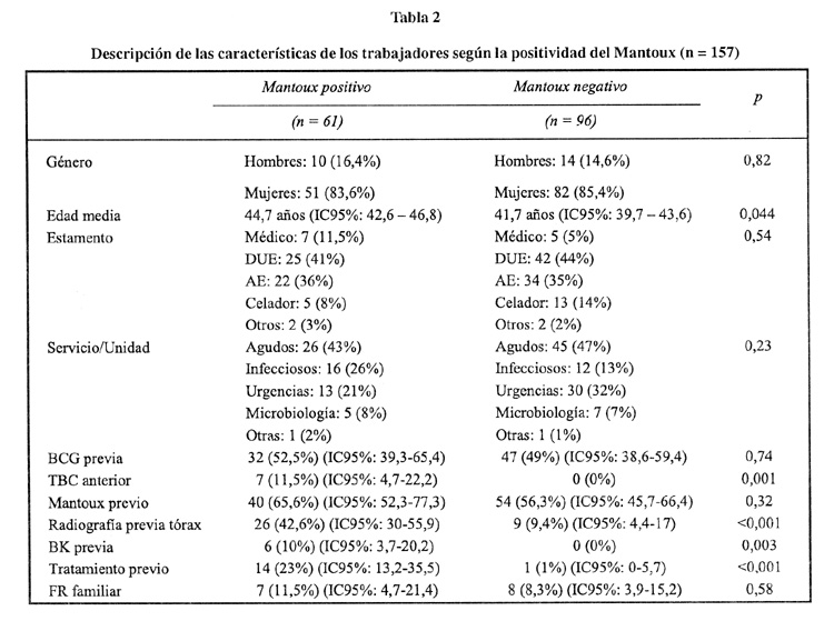 DUE: Diplomada Universitaria en Enfermería. AE: Auxiliar de Enfermería. BCG previa: Sujetos vacunados anteriormente. TBC anterior: Sujetos anteriormente diagnosticados y tratados frente a la TBC. Mantoux previo: Sujetos a los que se les había realizado previamente al estudio (por estudios de contactos realizados en cualquier momento) una prueba de Mantoux. RxTx previa: Sujetos a los que se les había realizado previamente al estudio (por estudios de contactos realizados en cualquier momento) una radiografía de tórax. BK previa: Sujetos a los que se les había realizado previamente al estudio una baciloscopia. Tto previo: Sujetos que habían sido tratados con isoniacida previamente al estudio (por quimioprofilaxis secundaria). FR familiar: Sujetos que tuvieron contacto previo con la TBC en el ámbito familiar.