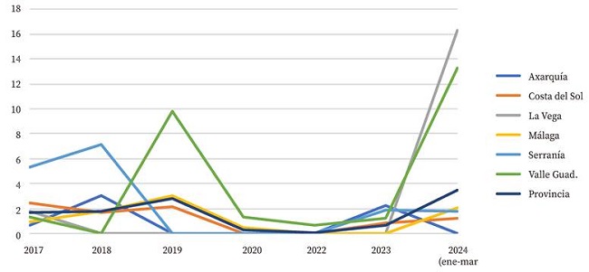 El número de casos/100.000 habitantes registrados en cada distrito sanitario tendió a mantenerse e incluso a reducirse en el periodo 2017-2020. Sin embargo, se observó un aumento de los mismos en el primer trimestre de 2024 que llegó a igualar o incluso superar a los años anteriores completos para cada mismo distrito (Fig. 2). Este aumento fue mucho más acentuado en La Vega y Valle del Guadalhorce, que a pesar de ser los dos distritos sanitarios menos poblados de toda la provincia, después de Serranía, registraron el mayor número de casos en el primer trimestre de 2024 (Tabla 1).