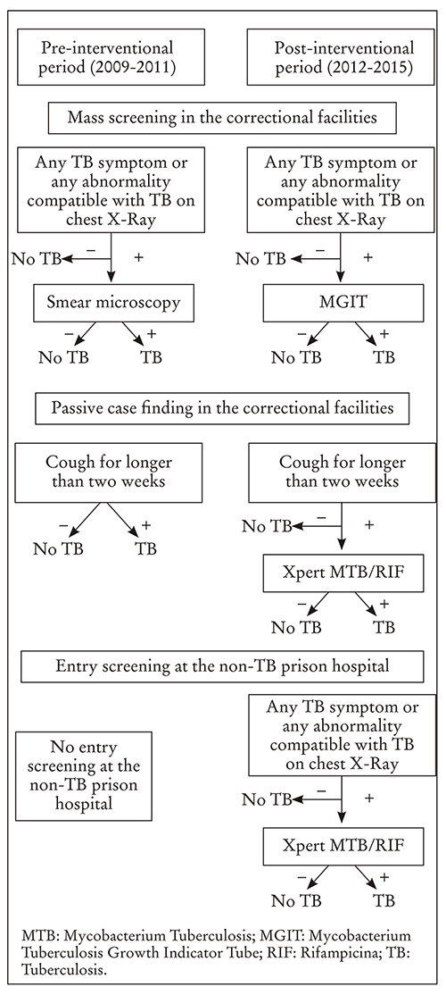If any of the five TB symptoms were present or any relevant radiographic abnormalities were detected (irrespective of whether the abnormalities were considered suggestive of active or inactive TB), a single sputum sample was collected and tested by smear microscopy. Patients with a positive microscopy result were isolated and referred to the prison TB hospital for further diagnosis and treatment. During the same period, identification of presumptive TB cases by passive case finding was based on the presence of cough for >2 weeks. Such cases were isolated and referred to the prison TB hospital for further diagnosis and treatment. In context of the current study, this period from January 2009 to December 2011 is defined as a pre-intervention period.