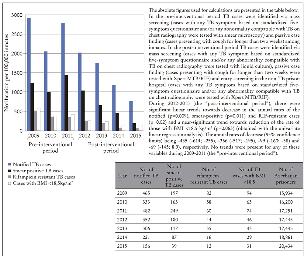 Table 1. Comparisons between the period, when the rapid tests for detection of TB (Xpert MTB/RIF and liquid culture) were introduced into mass screening and into passive case finding (post-interventional period), and the preceding period (pre-interventional period) for the overall number of identified smear-positive TB cases, RIF-resistant cases and those with BMI<18.5 kg/m2 at the diagnosis and the number of identified smear-positive TB cases, RIF-resistant cases and those with BMI<18.5 kg/m2 identified by mass screening and passive case finding. The aim was to show the impact of the inclusion of the rapid tests on the TB burden in the correctional facilities (Azerbaijan, 2009-2015).