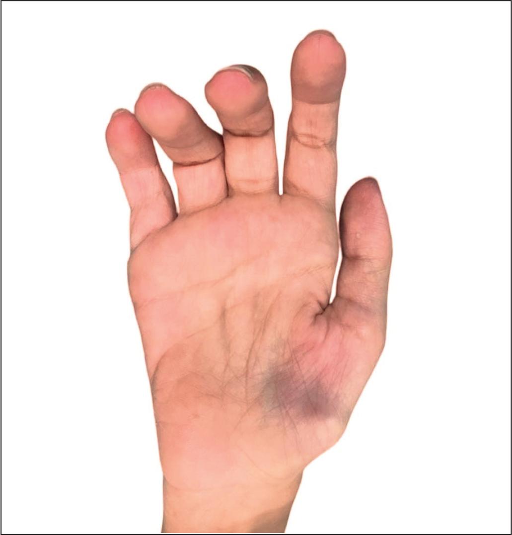 Presenta mano en garra y de simio, torpeza a la manipulación fina en miembros superiores y usa bastones ingleses de manera bilateral para la deambulación. Después de someterse a rehabilitación mediante el uso del cajón flamenco, refiere mejoría en la extensión de las articulaciones interfalángicas de ambas manos. Sin embargo, debido al dolor, presenta limitación en la fuerza prensil y en el apoyo palmar bilateral.