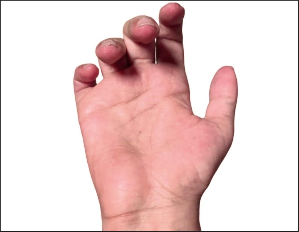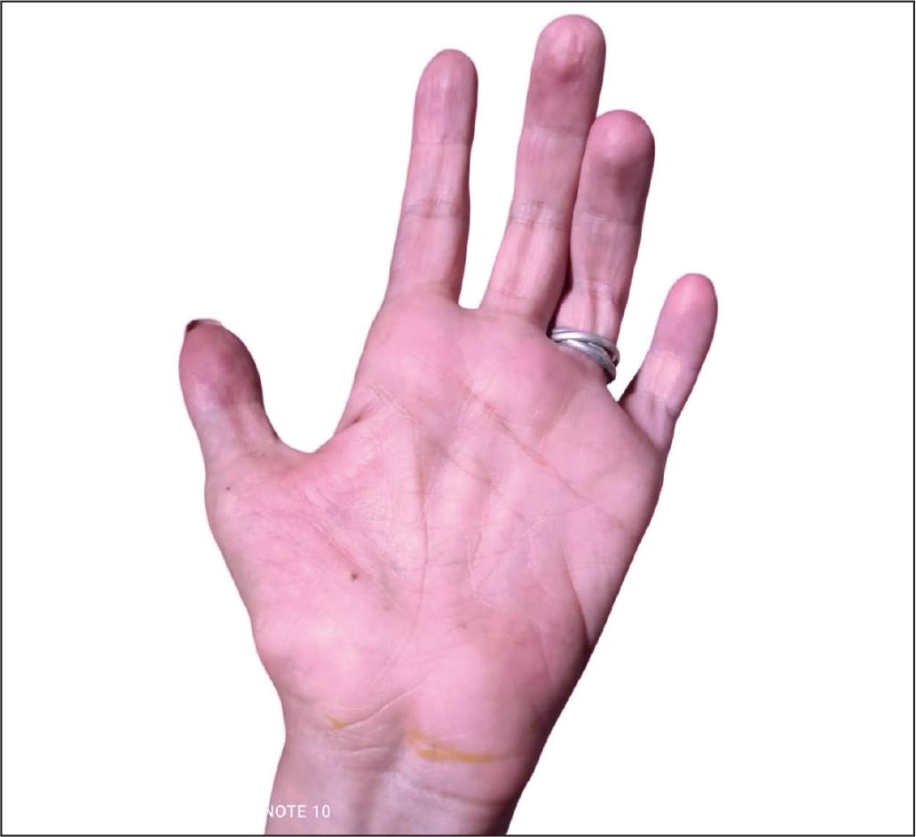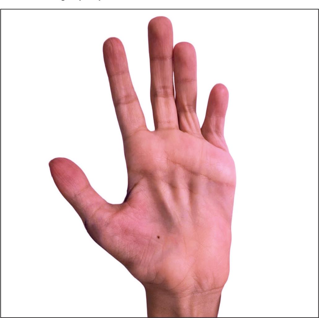A la exploración física evidenciamos un déficit severo generalizado de tejidos blandos en las palmas de ambas manos (superficie volar), con tendones flexores muy marcados (Fig. 1 y 2).