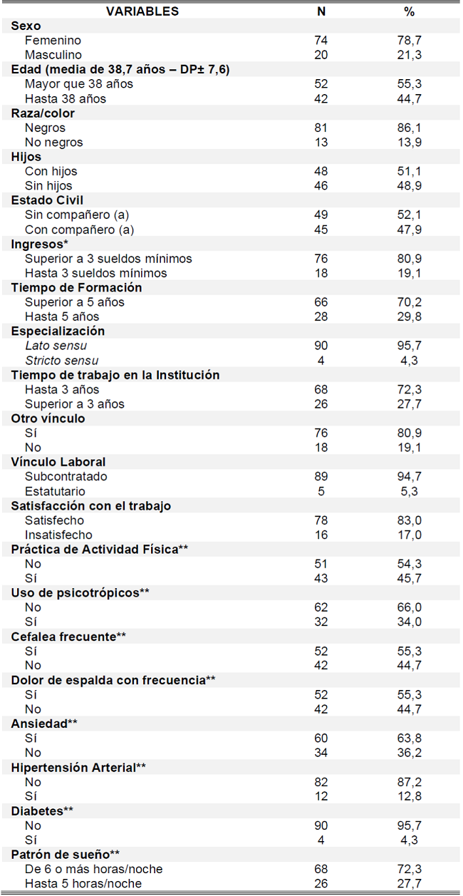 Se entrevistó a 94 enfermeros de cuidados intensivos, lo que corresponde al 91,3% del público objetivo. Las características sociodemográficas de los participantes se presentan en la Tabla 1. De los trabajadores, el 78,7% son mujeres. La mayoría eran mayores de 38 años (55,3%). Relativo a la raza/color, el 86,1% se declaró negro. De las enfermeras de cuidados intensivos estudiadas, 51,1% tienen hijos. En cuanto al estado civil, el 52,1% no tiene pareja. Acerca de los ingresos mensuales, el 80,9% reportó ingresos superiores a 03 sueldos mínimos.