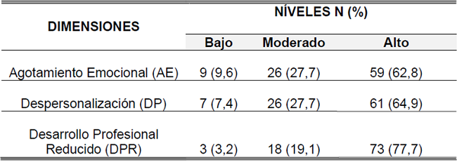 Tabla 2. Distribución de los resultados del Maslach Burnout Inventory (MBI) entre las enfermeras de cuidados intensivos. Salvador, Bahia, Brasil, 2021, (N=94).