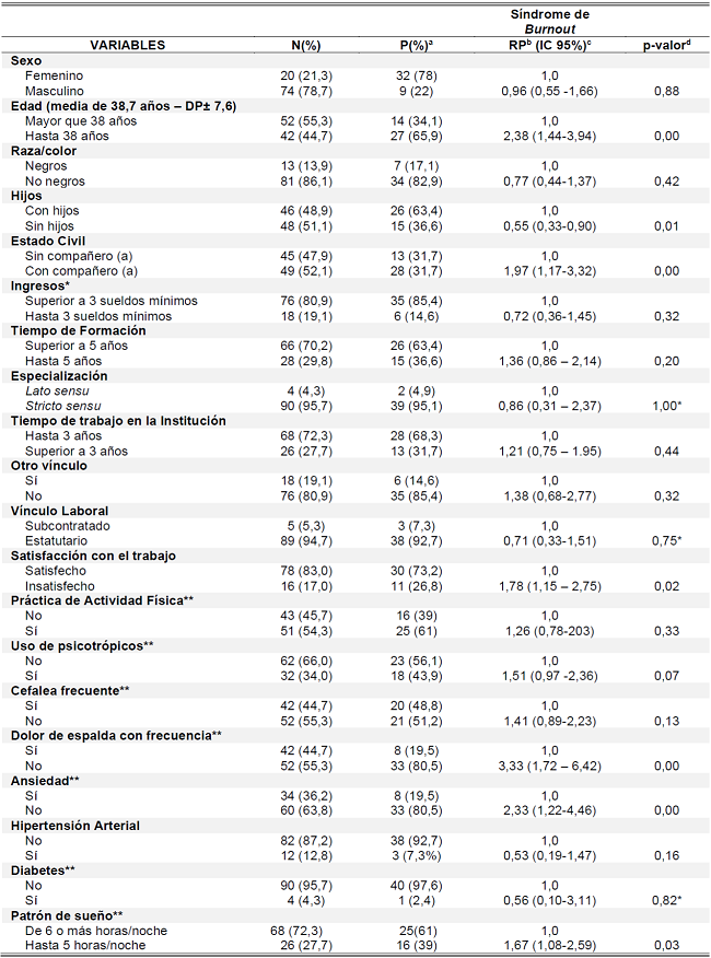 Las variables analizadas en la asociación con el SB fueron: sexo, edad, raza/color, hijos, estado civil, ingresos, tiempo desde graduación, especialización, tiempo de trabajo en la institución, otro vínculo laboral, tipo de vínculo laboral, satisfacción laboral, práctica de actividad física, uso de psicofármacos, cefalea, dolor de espalda, ansiedad, hipertensión arterial, diabetes y patrón de sueño.
