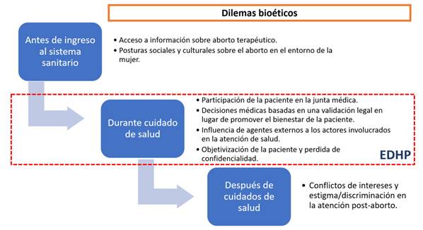 Figura 1. Conceptualización de los dilemas bioéticos que surgen en los diversos momentos del proceso de solicitud de aborto terapéutico en casos Perúanos de niñas y adolescentes con embarazos no deseados producto de violación sexual. EDHP: Enfoque de derechos humanos del paciente.