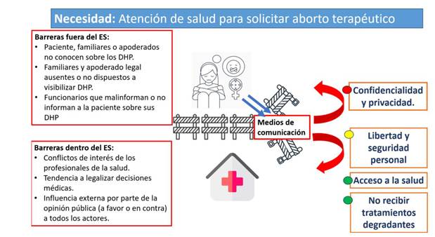 Figura 2. Barreras en el cuidado y rol de los medios de comunicación en casos de niñas o adolescentes con embarazos no deseados producto de violación sexual en Perú que solicitan aborto terapéutico. Rojo: derechos vulnerados; ambar: derechos en peligro de ser vulnerados; verde: derechos cuya protección se ve reforzada.