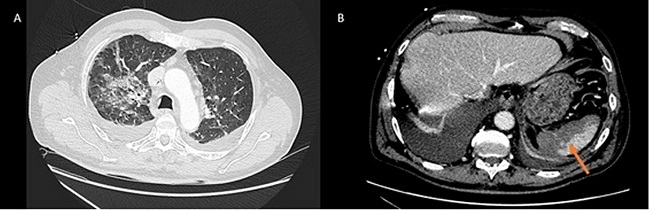 Figure 1: Computed tomography. Bilateral pulmonary infiltrates (Image A) Image compatible with splenic infarction (Image B).