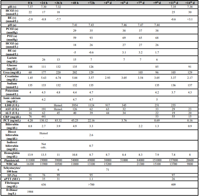 BE: Base excess; AST: Aspartate aminotransferase; ALT: Alanine aminotransferase; CRP: C-reactive protein; PCT: Procalcitonin; WBC: White blood cells; PT: Prothrombin; aPTT: Activated partial thromboplastin; Hemol.: Hemolyzed; Not calc: Not calculable.