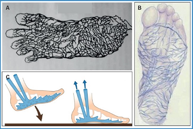 Félix Lejars, en 1894, señaló la importancia de las venas plantares para el correcto retorno venoso de las piernas y acuñó el término “suela plantar”. Efectivamente, un buen drenaje venoso comienza por la existencia de una eficaz bomba venosa en el pie, o aplastamiento de la suela o esponja venosa plantar, que exprima hacia arriba la sangre almacenada en los plexos venosos del pie (Fig. 1A-C) (2).