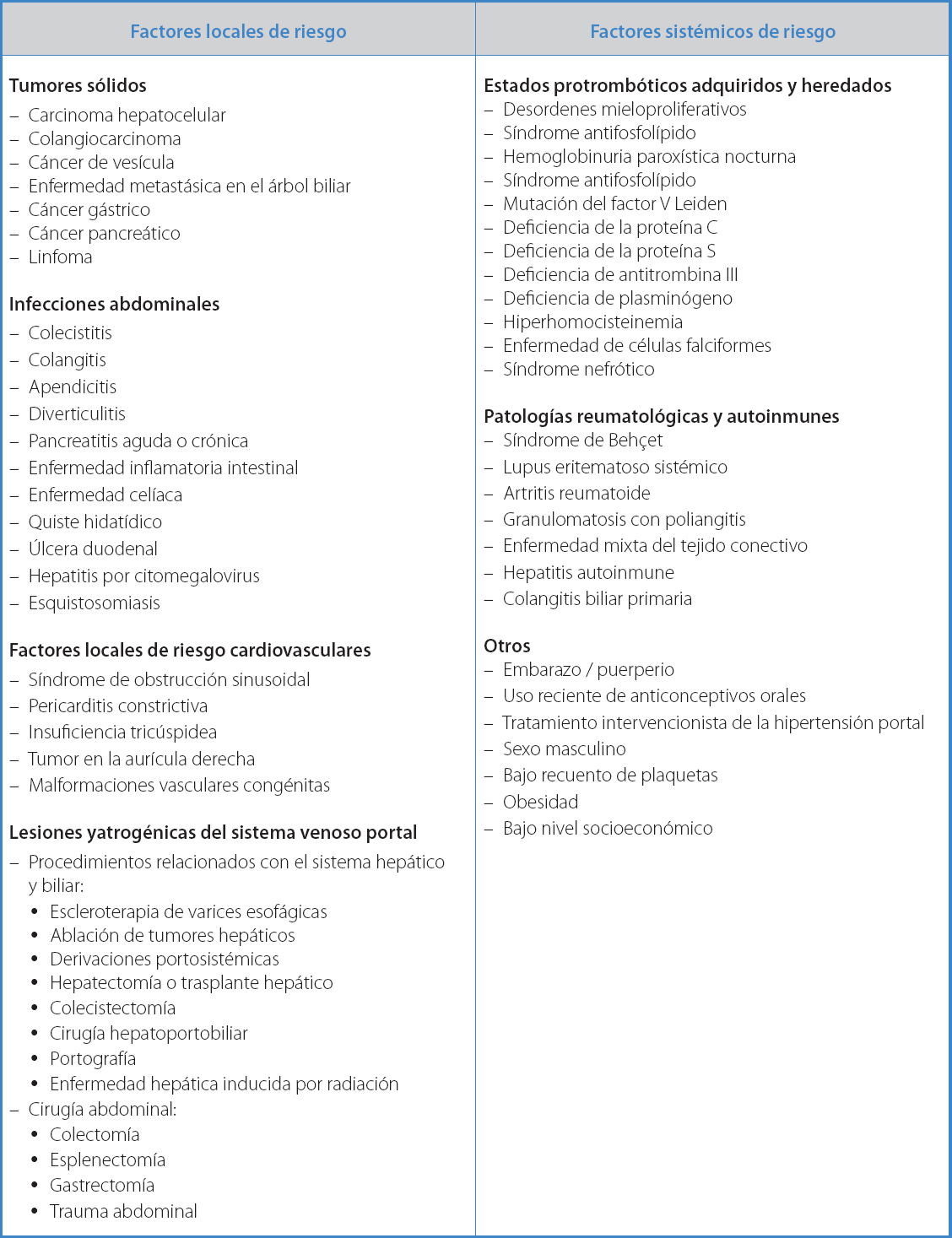 Como se mencionó previamente, el mayor porcentaje de las trombosis portales son generadas por cirrosis (28 %) y el cáncer hepatobiliar ya sea primario (23 %) o metastásico (44 %), luego se encuentran las infecciones, enfermedades inflamatorias y cirugías abdominales (10 %) y, por último, están las enfermedades protrombóticas hereditarias o adquiridas, entre las que destaca el síndrome antifosfolípido (11,18-25). La tabla II resume las principales causas de trombosis de la vena porta diferentes a la cirrosis.