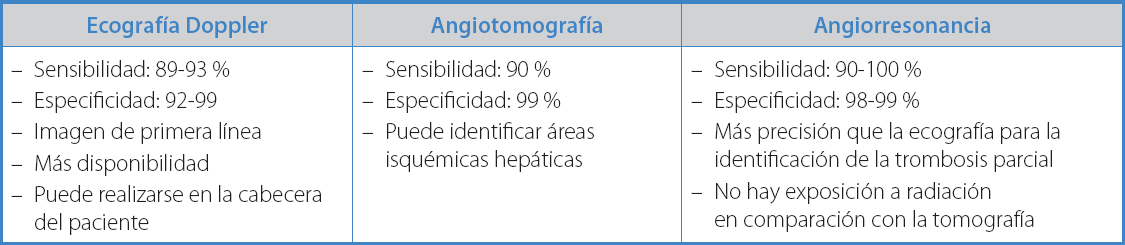 Una vez identificada la trombosis de la vena porta, es necesaria la realización de otras imágenes abdominales, con el fin de evaluar la extensión y ampliar los estudios en búsqueda de la etiología. En el caso de la tomografía, tiene mejor precisión para el diagnóstico de la extensión de la TVP a las venas mesentéricas o el lecho vascular esplénico. Por su parte, la resonancia magnética ofrece como ventaja la ausencia de exposición a la radiación (53). A continuación, se presenta una comparación entre las diferentes imágenes diagnósticas utilizadas (Tabla III).