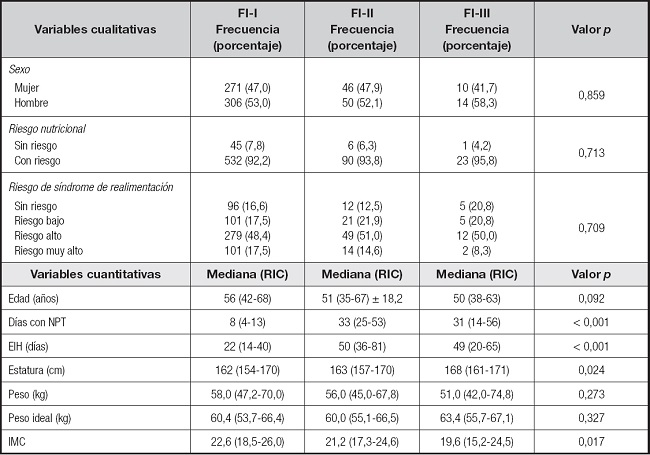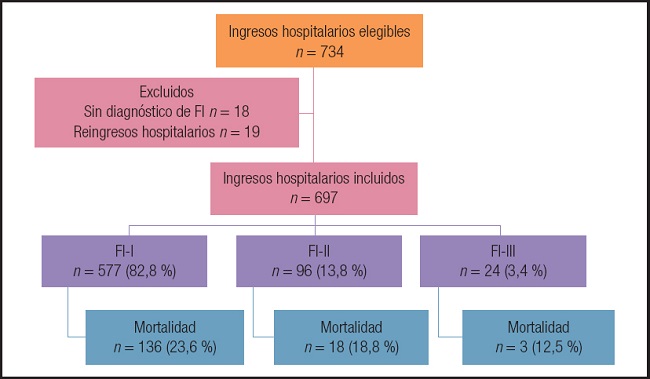 Fueron elegibles 734 ingresos hospitalarios de pacientes que recibieron soporte nutricio con NP. Se excluyeron 18 que no tuvieron diagnóstico de FI y 19 por motivos de reingresos hospitalarios. Finalmente, se incluyeron 697, la mediana de edad fue de 56 (41-68) años y 327 fueron mujeres (46,8 %), con IMC de 22,4 (18,3-25,9). El diagnóstico fue: FI-I en 577 (82,8 %) pacientes, FI-II en 96 (13,8 %) y FI-III en 24 (3,4 %). Fallecieron 157 (22,5 %) pacientes durante el internamiento, de 59 (45-69) años vs. 55 (39-67) años en los que sobrevivieron (p = 0,033). La figura 1 muestra la clasificación de los pacientes de acuerdo a los diferentes tipos de FI, así como la proporción de pacientes que murieron en cada grupo, sin diferencia significativa entre ellos (p = 0,283).