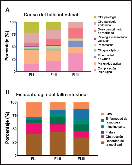 Figura 2. Comparación de la causa (A) y fisiopatología (B) del fallo intestinal entre los diferentes grupos de los pacientes del estudio. Se muestra la comparación realizada con la prueba de Chi-cuadrado, que evidenció que existen diferencias significativas (p = 0,002 y p < 0,001, respectivamente) (FI-I: fallo intestinal tipo I; FI-II: fallo intestinal tipo II; FI-III: fallo intestinal tipo III).