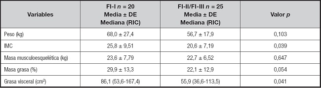 En la tabla II se muestra la comparación de las variables bioquímicas al ingreso y después de 21 días con NP en aquellos pacientes que continuaban alimentándose por esta vía, independientemente del tipo de FI. Se documentó que ALT, aspartato aminotranferasa (AST), fosfatasa alcalina (FA), glucosa y nitrógeno ureico (BUN) aumentaron, mientras que bilirrubinas, creatinina y PCR disminuyeron en este periodo. En cuanto a los resultados de composición corporal la tabla III y la figura 3 muestran que el peso y la grasa visceral de los pacientes con FI-I son significativamente menores que en aquellos que tuvieron más de 21 días con NP (F-II/III); en contraste, aquellos con FI-I tienen mayor retención hídrica y menor AF.