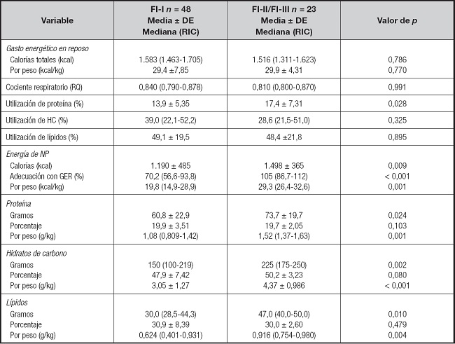 En aquellos pacientes con calorimetría indirecta, el porcentaje de adecuación fue del 70 % en los pacientes con FI-I en comparación con el FI-II/III, donde fue del 105 %, probablemente en relación con el tiempo que requieren la NP y la estabilidad metabólica (37).