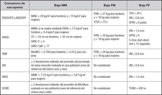 ANZSSFR: Sociedad Australiana y Neozelandesa para la Investigación de la Sarcopenia y la Fragilidad. AWGS: grupo asiático de sarcopenia; CP: circunferencia de la pantorrilla; DEXA: absorciometría de rayos X de doble energía; EWGSOP2: grupo europeo de sarcopenia en adultos mayores; IMMA: índice de masa muscular apendicular; IMC: índice de masa corporal; IWGS: grupo internacional de sarcopenia; FF: función física; FM: fuerza muscular; FNIH: Fundación para el Instituto Nacional de Salud; FPM: fuerza de prensión máxima; MM: masa muscular; MMA: masa muscular apendicular; MA: masa apendicular; RF: rendimiento físico; SIG: grupo con interés especial; SCWD: Sociedad de Sarcopenia y Caquexia; TC6M: Test de caminata de 6 minutos; TUG: Timed Up and Go; VM: velocidad de la marcha; STS5: test de levantada de 5 segundos; SPPB: Short Physical Performance Battery.