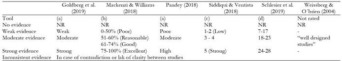 Notes:(a) Quality assessment tool for quantitative studies; (b) Downs & Black checklist, (c) Ccombination of Maryland Scale of Scientific Method and other criteria; d); Own evaluation system; NR, Not reported.