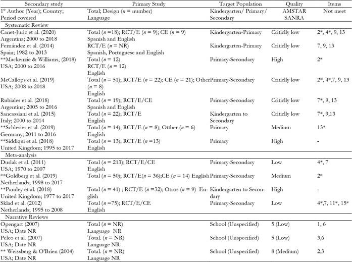 Regarding the programs analyzed, all 15 reviews (100%) included curricular programs, targeting a universal population, and were implemented at the level of primary education. Two of these (13.3%) were exclusive to primary education (Schlesier et al., 2019; Siddiqui & Ventista, 2018), and 13 (86.6%) additionally included students from other ages or stages of education. In the 2 reviews that addressed primary education exclusively, the participants’ age in the primary studies ranged from 5 to 12 years; in the reviews with a mixed population the ages ranged from 3 to 21.
