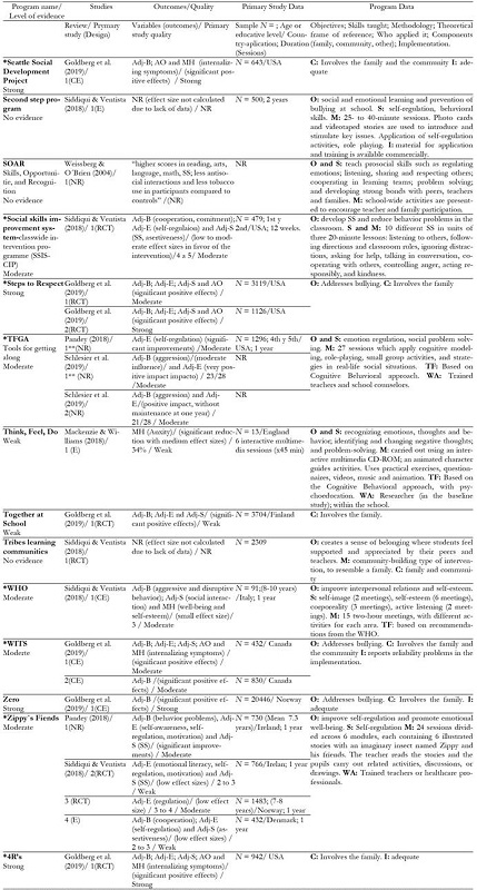 For the program analysis, we considered only those programs that were reported in medium- or high-quality reviews or meta-analyses (n = 6). A total of 39 social-emotional development programs, applied in primary education, were counted. Table 3 presents the data on level of evidence, results, and characteristics for all of these.