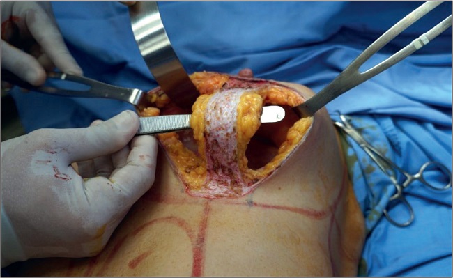 Iniciamos el procedimiento bajo anestesia peridural alta entre la vertebra dorsal 6ª y la dorsal 7ª y con sedación endovenosa, brazos abiertos con paciente en decúbito dorsal. Infiltramos solución de Klein a nivel subdérmico para la decorticación y hemostasia con electrocauterio. Confeccionamos el colgajo vertical bipediculado, la cavidad donde será posicionado el implante en caso de que este sea necesario, elevamos y fijamos en su nueva posición el CAP suturando con 4 puntos cardinales de nylon 4-0 y luego jareta circular en 3 planos, primero con nylon 3-0, luego poliglactina de 4-0 en el subdérmico y finalmente, en el intradérmico, con sutura absorbible sintética monofilamento 4-0. Al fijar el nuevo CAP estamos tensionando y traccionado el colgajo vertical bipediculado, el cual queda ubicado por delante del implante. Posteriormente fijamos la base de este sobre el musculo pectoral con 2 puntos simples de poliglactina 2-0 a cada lado; esta maniobra empuja el implante, lo sostiene y sirve de hamaca protectora en caso de dehiscencia de la sutura, así como de refuerzo importante en la línea media. Seguidamente procedemos al avance de los pilares mediales y laterales sobre la línea media suturándolos y fijándolos entre si con el colgajo vertical bipediculado, concluyendo el acto quirúrgico con la sutura intradérmica con hilo absorbible. Dejamos drenajes tipo sonda K30 de aspiración en cada lado y acabamos con cura oclusiva y colocación de sostén postoperatorio.