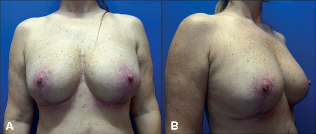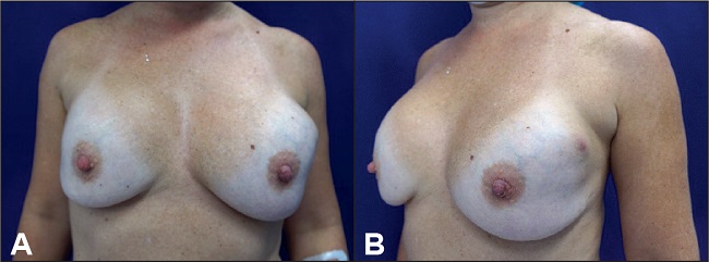 Fig. 8 A y B. Grupo 3: mastopexia con retirada definitiva de implantes. Paciente de 55 años, antecedentes de 2 cirugías mamarias previas (prótesis de mama y mastopexia periareolar secundaria). Desconocía el volumen de los implantes. Ptósis grado III de Regnault.