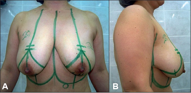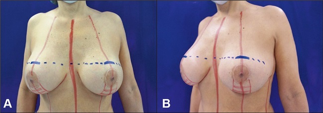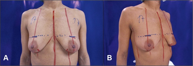 Figura 1. Marcaje final de la técnica propuesta. Paciente de 53 años con 2 cirugías previas, prótesis mamarias implantadas hace 16 años con asimetría mamaria. Propuesta técnica: retirada definitiva de implantes y mastopexia con tejidos propios usando la técnica del colgajo vertical bipediculado.