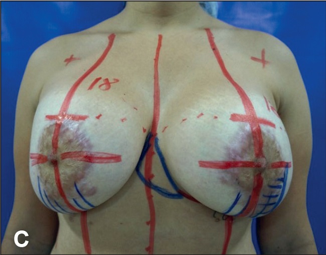 Fig. 6 C. Planificación quirúrgica: en azul, marcaje del colgajo vertical bipediculado; en rojo el punto A de Pitanguy a 18 cm. Mastopexia con cambio de implantes a 280 cc en plano submuscular.