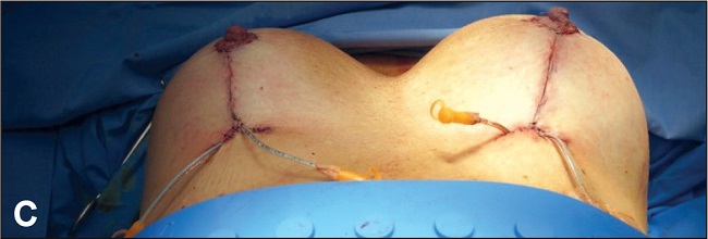 Figura 7 C. Fin de la cirugía: mastopexia con colgajo vertical bipediculado y cambio de implantes a redondos de 250 cc en plano subglandular más lipotransferencia en cuadrante superior externo.