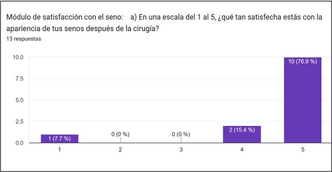 Módulo de satisfacción con el seno: de las 13 pacientes tomadas como muestra en nuestra encuesta, 10 (76.9%) calificaron con 5 puntos y 2 (15.4%) con 4 puntos; en contrapartida 1 paciente mencionó no estar satisfecha (Gráfico 2).