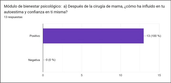 Módulo de bienestar psicológico: satisfacción con la apariencia visual de los senos, autoconfianza y preocupación por el aspecto físico personal de cada mujer operada, así como ansiedad, depresión y cambios lábiles en la emoción. Las 13 pacientes manifestaron sentir confianza en sí mismas y autoestima positiva tras la intervención Gráfico 3).