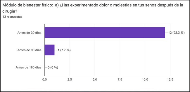 Módulo de bienestar físico: las molestias se presentaron antes de los 30 días de postoperatorio en el 92.3% (12 pacientes) de las mujeres encuestadas y el 7.7 % (1 paciente) las tuvo hasta los 90 días de postoperatorio, demostrando un dolor o molestia presente en el postoperatorio temprano, común en cualquier proceso operatorio (Gráfico 5). Aunque no se especificó el tiempo, las 13 pacientes respondieron no presentar ninguna limitación física en las actividades diarias tras la operación