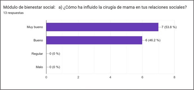 Módulo de bienestar social: valorando la autoconfianza, las relaciones entre las personas y la participación social, así como el apoyo emocional postoperatorio, las 13 pacientes respondieron que era muy bueno y bueno el grado de influencia ante la sociedad, así como también las 13 manifestaron comodidad a la hora de lucir visualmente el resultado de la operación. Siete pacientes (53.8%) mencionaron este resultado como muy bueno y 6 (46,2%) como bueno (Gráfico 6).