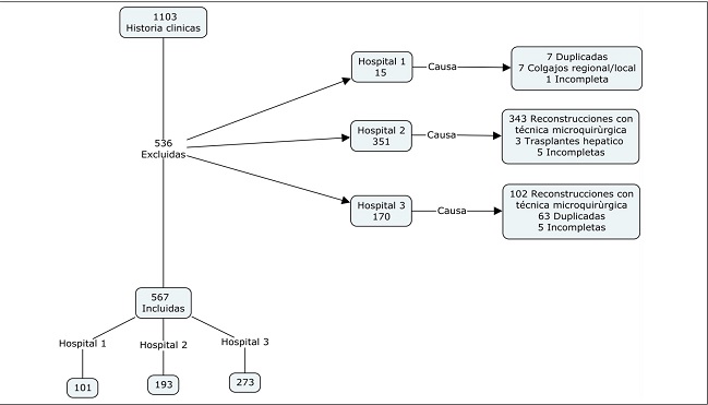 Realizamos un estudio analítico de corte transversal revisando las historias clínicas de pacientes sometidos a cirugía reconstructiva con colgajos libres en 3 instituciones de salud en la ciudad de Medellín, Colombia, durante el periodo comprendido entre 2017 y 2021. Llevamos a cabo un muestreo no probabilístico por conveniencia en las bases de datos institucionales de las entidades estudiadas, seleccionando pacientes de todas las edades a quienes se les habían realizado procedimientos quirúrgicos durante el periodo de estudio y fueron codificados según la Clasificación Única de Procedimientos en Salud (CUPS) en Colombia, actualizada en el 2022 con los códigos correspondientes con colgajos libres: 867105 correspondiente a Colgajo libre cutáneo con técnica microvascular y 867106 correspondiente a Colgajo libre compuesto con técnica microvascular.