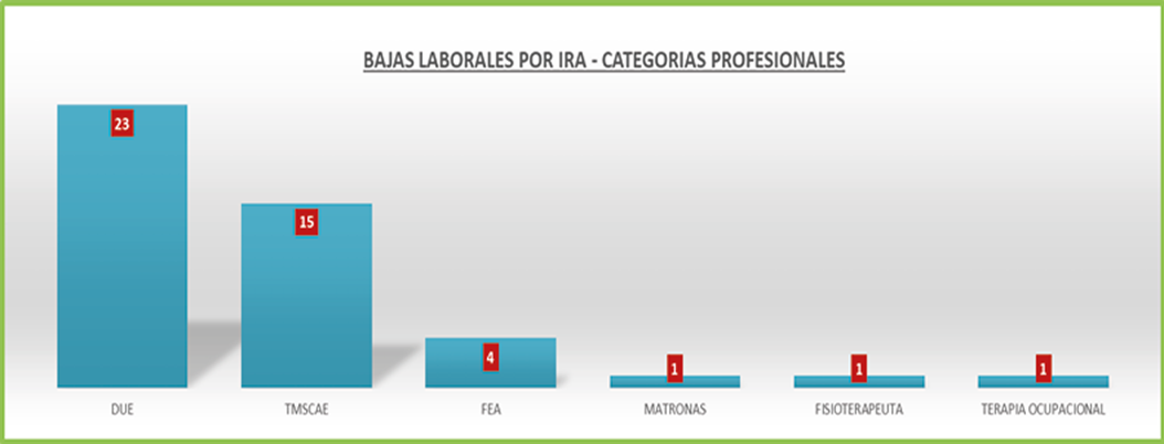 De las 45 bajas laborales por infecciones respiratorias agudas que se produjeron, el 51,11 % correspondieron a los Diplomados/Graduados Universitarios en Enfermería y el 33,33 % a los TMSCAE, con unas tasas de vacunación que fueron del 44 % y 43 % respectivamente, en cambio los Facultativos con una tasa de vacunación del 55 % sufrieron una incidencia de bajas laborales por IRA del 8,89 %. Por lo tanto, los DUE y los TMSCAE son unas categorías profesionales altamente expuestas a las Incapacidades Temporales por Infecciones Respiratoria Agudas con un total del 84,44 % de las IT y con medias de coberturas vacunales de la Gripe inferiores a las de otros grupos profesionales, por lo que habría que incidir en ello en próximas estrategias de vacunación, para aumentar estas tasas vacunales para poder disminuir esa alta incidencia de absentismo laboral por infecciones respiratorias agudas y así contribuir a disminuir el riesgo de infecciones nosocomiales de los pacientes que atienden.