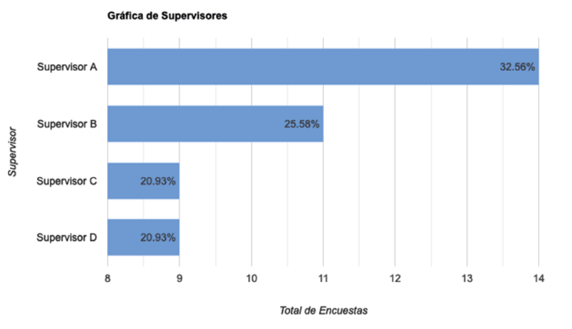 Se aplicó el Maslach Burnout Inventory (MBI) a los 43 empleados del área de bondeado, distribuidos entre cuatro supervisores. En la Fig.2 "Gráfica de Supervisores”, se observa que el Supervisor A concentra el 32.56% del total de encuestas, seguido del Supervisor B con el 25.58%, mientras que los supervisores C y D tienen el 20.93% cada uno. Este dato sugiere que una proporción mayor de los empleados encuestados trabaja bajo la supervisión de los supervisores A y B18.