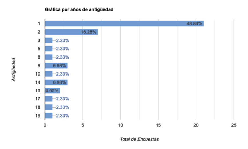 En cuanto a la antigüedad de los empleados Fig. 3, la mayoría tiene un año de experiencia (48.84%), seguida por el grupo con dos años de antigüedad (16.28%). Un porcentaje menor tiene entre 5 y 19 años de servicio. Este aspecto es relevante para analizar cómo el tiempo de servicio puede influir en los niveles de burnout19.
