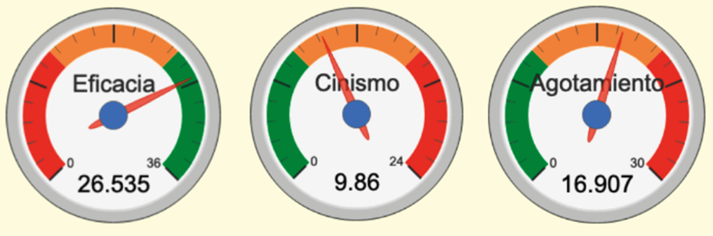 Finalmente, los resultados de las tres subescalas del MBI se muestran en gráficos tipo indicador: