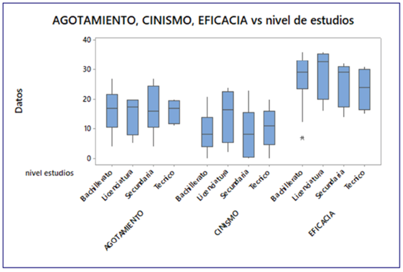 El gráfico (Figura 5) muestra que los empleados con un nivel máximo de estudios correspondiente a secundaria reportan mayores niveles de agotamiento y cinismo en comparación con aquellos con estudios superiores, lo que sugiere que una menor formación académica podría estar relacionada con un mayor nivel de burnout23. Por otro lado, los empleados con mayor nivel de estudios (especialmente los de licenciatura y maestría) presentan una mayor eficacia profesional, lo que indica que, a mayor formación académica, los empleados tienden a percibir más control o efectividad en sus tareas.