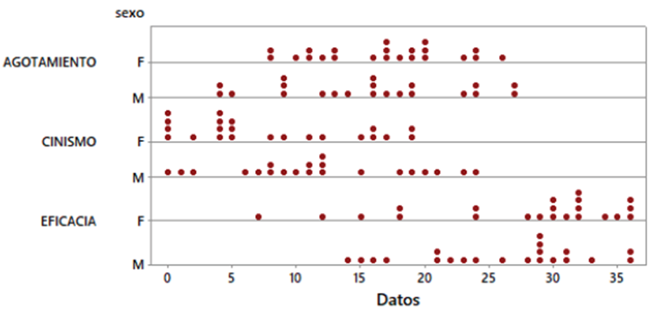 La gráfica presentada en la Figura 6 compara los niveles de agotamiento, cinismo, y eficacia profesional en función del género (F para femenino y M para masculino).